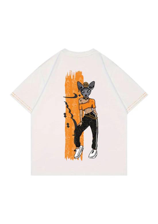 Embrace the grace of the cat goddess Bastet with our unisex Bastet T-Shirt. Made from soft 100% breathable cotton, this short-sleeve tee features a vibrant illustration of Bastet in warm orange on the back, adorned with gold foil details and her name written in beautiful Arabic calligraphy with a matching orange sleeve stitching that adds a striking detail.