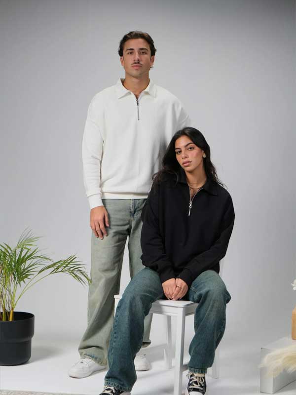 Introducing our new quarter zip sweaters – a blend of luxury and comfort. Immerse yourself in the soft, heavy fabric that defines coziness and quality. The metallic zippers add a touch of sophistication, while the perfect fit ensures style meets comfort seamlessly.